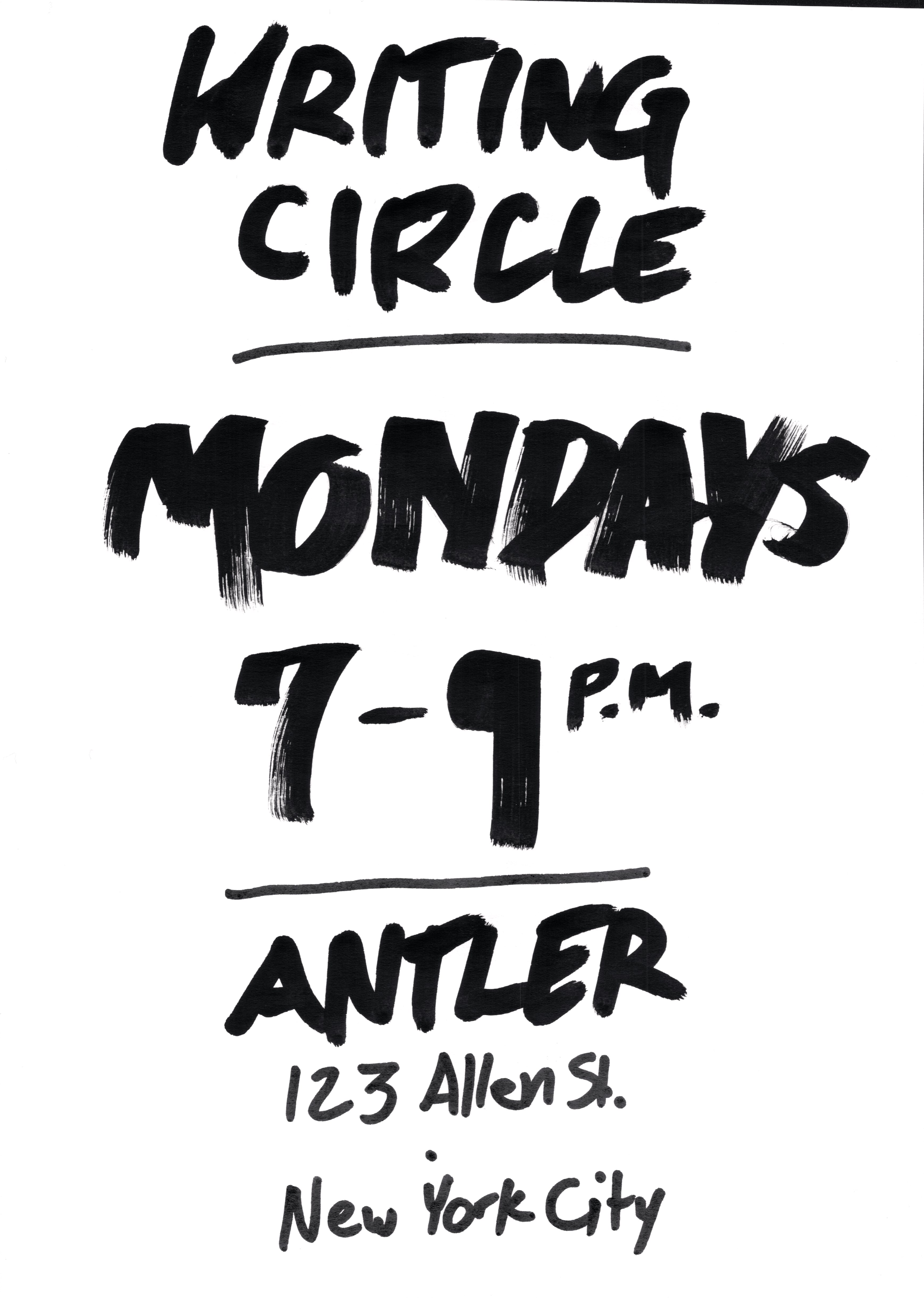 A night for unstructured writing outside of the apartment. Write, hang, and meet new friends. Most Mondays, at the same place as always.
